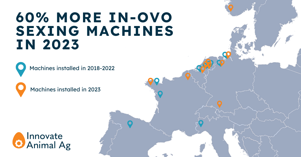 Original research conducted by Innovate Animal Ag in 2023 showed that as of September 2023, 15% of the layer population in Europe had been produced with in-ovo sexing. Much of this growth in machine installations would not be captured in this figure, since each machine needs some amount of time to become operational. Additionally, five of the ten new machines were installed in Q4, after the 15% figure was calculated. Therefore, total market penetration of in-ovo sexing will accelerate rapidly going into 2024 and beyond.