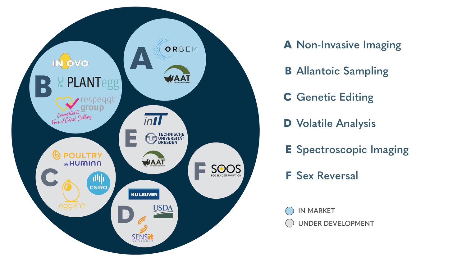 A number of innovative companies and labs around the world are developing in-ovo egg sexing techniques to solve this problem. These technologies determine the sex of the embryo early in incubation, so that male eggs can be destroyed before they hatch.