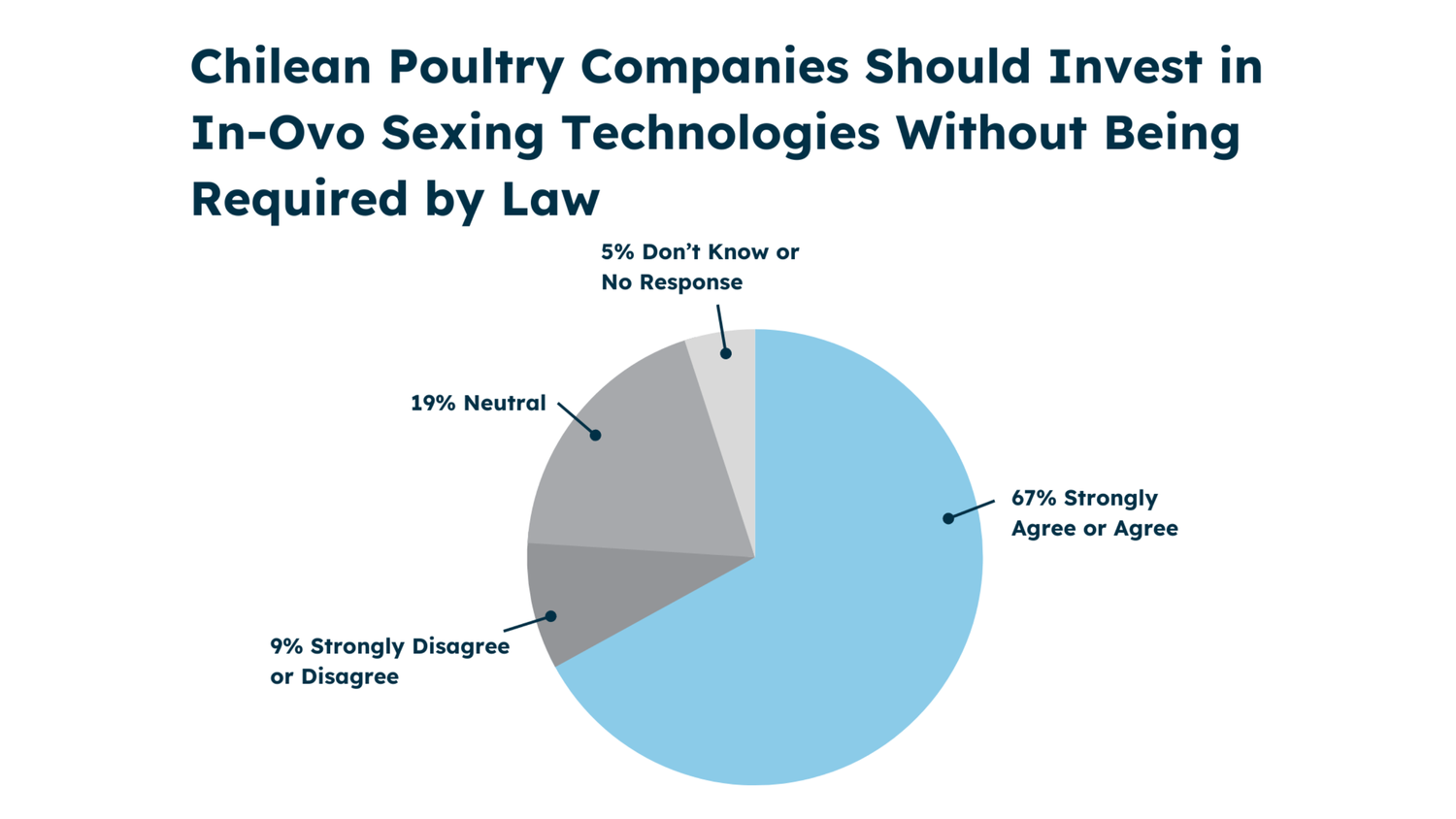 Finally, a survey of 500 Chilean consumers, commissioned by the Veg Foundation and run by the multinational market research firm IPSOS, sheds further light on this global consensus. Two-thirds of respondents agreed that the egg industry should take the initiative to invest in in-ovo sexing technologies without waiting for any legal mandate.